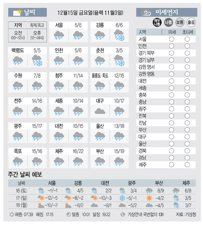 [날씨이야기] 12월15일 금요일(음력 11월3일)