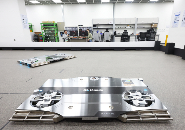 14일 오후 경기 성남시 수정구 만도넥스트M 사옥에서 열린 HL만도의 자율주행 주차로봇 ‘파키’ 시연회에서 파키가 움직이고 있다.