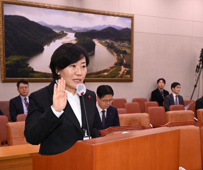 송미령 농림축산식품부 장관 후보자가 18일 오전 국회 농림축산식품해양수산위원회에 출석, 인사청문회에 앞서 선서를 하고 있다.