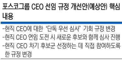 TF가 만든 개선안에는 현직 CEO가 ‘CEO 승계 카운슬’의 당연직 멤버로 포함되는 기존 규정을 변경하는 내용도 추가된 것으로 알려졌다. 포스코그룹 회장 선임 절차는 CEO 승계 카운슬이 후보군을 발굴해 CEO 후보추천위원회에 전달하면, CEO 후보추천위원회가 이 중 회장을 선출하는 과정을 거친다. 업계 관계자는 “이 규정을 변경하는 것은 차기 회장 선임 과정에서 현직 회장의 ‘입김’을 사전에 차단하겠다는 것”이라며 “결국, 회장 선출 시 현 회장이 가진 프리미엄을 대폭 내려놓겠다는 의미”라고 말했다.
