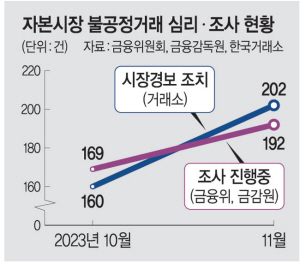 자본시장 불공정거래에 대한 조사는 일반적으로 ‘시장감시·심리(거래소)→조사(금융위·금감원)→고발·통보(증권선물위원회)→수사·기소(검찰)→재판(법원)’ 순으로 진행된다. 최근 불공정거래 심리·조사 현황을 보면 지난달 기준 거래소가 내린 시장경보 조치는 총 202건으로 전달(160건) 대비 42건 늘었다.