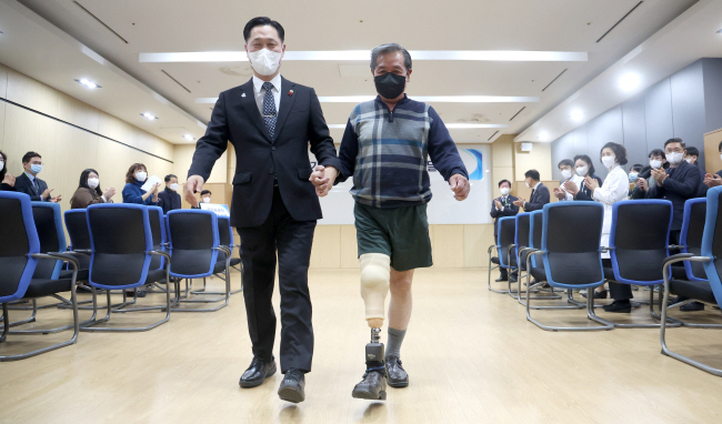 지뢰 사고로 다리를 잃은 국가유공자 장원종 씨가 27일 서울 강동구 중앙보훈병원에서 이희완 국가보훈부 차관에게 로봇 의족을 전달받은 후 걷고 있다.