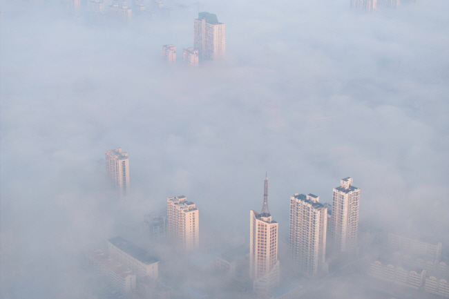 28일 중국 동부 장쑤성 화이안시의 도심 건물들이 짙은 스모그에 휩싸여 있다. 올해 중국의 초미세먼지 평균 농도는 지난해 대비 3.6% 짙어져, 2013년 이후 10년 만에 악화한 것으로 조사됐다.