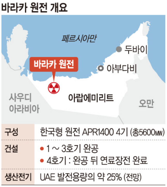 UAE는 오는 2050년 ‘넷 제로’(Net Zero·탄소 순 배출량 제로)를 목표로 원전·신재생·친환경 에너지에 사활을 걸고 있다. 특히 우리나라 기술로 독자 개발한 차세대 한국형 원전노형(APR1400)이 지난 2009년 UAE에 수출된 이후 ‘신(新) 중동붐’을 이끌고 있다. UAE 바라카 원전사업은 2009년 한국전력공사가 수주한 한국의 APR1400 4개 호기를 아부다비 알다프라 지역에 건설하는 세계 최대 원전건설 프로젝트다. 현재 1·2·3호기가 모두 가동되고 있으며, 4호기는 올해 가동을 앞두고 있다. 1∼4호기 모두 상업 운전할 경우 총 5600MW의 무탄소 전기 생산이 가능하며, 이는 UAE 전력 수요의 약 25% 수준에 달한다.