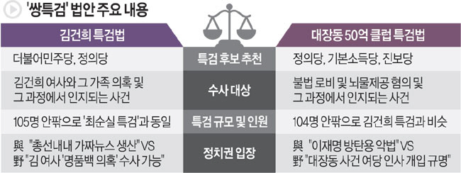 거부권 행사에 대한 부정적인 여론에도 정부가 즉각적인 거부권 행사 방침을 정한 것은 쌍특검 법안 자체가 총선을 앞둔 야권의 전략이라는 판단에서다. 우선 특검 후보 추천 단계에서 김 여사 의혹과 ‘대장동 50억 클럽’ 관련 특검 법안 모두 윤 대통령과 여권의 의견이 원천 차단돼 있다. 김 여사 의혹에서는 민주당·정의당, 50억 클럽에서는 정의당·기본소득당·진보당 등 야권에만 후보 추천권이 있다고 명시됐다. 국민의힘은 피의사실 이외 수사 과정에서 특검의 언론 브리핑 조항(특검법 12조)에 대해서도 ‘독소 조항’이라고 반발해 왔다.