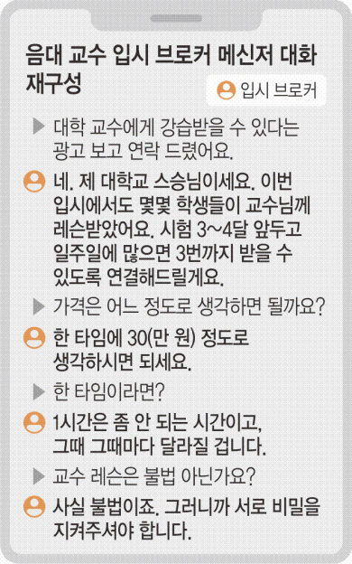 피아노 입시 강사이자 브로커인 C 씨는 “서울대, 연세대 수준을 희망하는 학생들은 불법임에도 불구하고 교수 레슨을 받는 경우가 많다”며 “무언가를 배운다는 목적보다는 미리 심사받을 교수님께 얼굴을 비친다는 의미”라고 설명했다. C 씨는 교수 레슨은 1타임당 1시간이 채 안 되지만 가격은 수십만 원에 달한다고 했다. 성악과 입시 강사 D 씨는 불법 레슨을 한 뒤, 자신의 불법 행위가 탄로 날까 봐 과외를 해준 학생을 떨어뜨리는 교수도 있었다고 증언했다.
