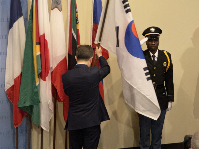 2024~2025년 안보리 비상임이사국으로 활동하기 시작한 한국은 이날 안보리 회의장 앞 약식 기자회견 장소에 국기를 게양(사진)했다. 황 대사는 행사에서 “우리는 오늘날 세계가 직면한 심각한 도전을 인식하면서 안보리의 역할에 대한 기대가 그 어느 때보다 크다는 점을 인식하고 있다”며 “실제로 오늘날 상호연결된 글로벌 이슈의 복잡성으로 인해 안보리를 통한 집단적이고 단호한 대응이 필요한 상황”이라고 강조했다.