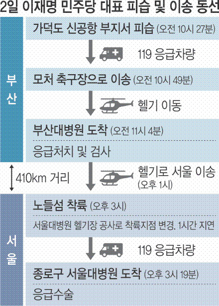 이재명 더불어민주당 대표가 피습을 당한 뒤 헬기를 타고 부산에서 서울대병원으로 이송된 것을 두고 4일 논란이 확산하고 있다. 의전서열 8위인 제1야당 대표에게 맞는 대우라는 입장과 지방의료를 구축해야 한다는 민주당의 기조와 모순된다는 비판이 충돌하면서 ‘특혜’ 여부를 두고 갑론을박이 벌어졌다. 정치권에서는 총선을 앞두고 “부산지역 민심을 잃었다”는 우려도 흘러나오고 있다.