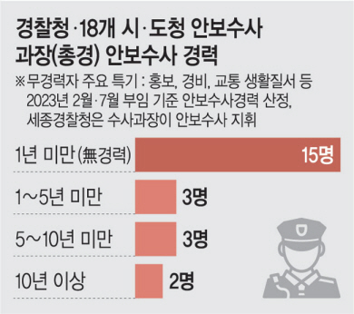 그러나 최소 7∼10년을 한 분야에서 장기 수사하는 경력이 요구되는 대공 수사와 일반 수사 분야는 결이 다른 만큼, 무경력자가 지휘관에 배치될 경우 수사 전문성이 떨어질 것이란 우려가 커지고 있다. 유동열 자유민주연구원장은 “형사·수사 업무를 아무리 많이 했더라도 대공 경험이 없으면 간첩 수사를 제대로 지휘할 수 없다”면서 “고도의 기술이 필요한 심장 분야 전문의가 없다고 정형외과 의사에게 칼을 쥐여 주고 심장 수술을 시킬 수는 없는 것 아니냐”고 비판했다. 지난해 2월과 7월 총경 인사 때도 경찰청과 시·도청에 무경력자가 안보수사과장에 다수 배치돼 6개월∼1년째 지휘하고 있다. 경찰청을 포함해 18개 시·도청 안보수사과장직을 맡은 총경 23명의 경력을 전수조사한 결과, 안보 수사 경험자는 8명에 그쳤다. 한 경찰 간부는 “안보 수사 기능이 찬밥 신세인 탓에 경험 있는 간부를 찾을 수 없다”고 말했다. 이달 총경 승진자 135명 중 안보 수사 분야에선 단 2명이 승진했고 경무관 승진자는 0명이었다.