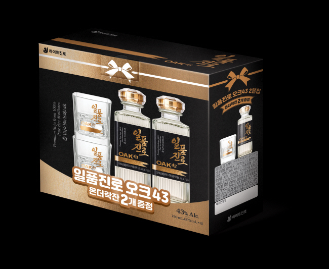 로열프리미엄 증류주 일품진로 오크43 선물세트는 375㎖ 2병과 온더락 잔 2개로 꾸몄다. 이 제품은 하이트진로가 엄격한 온도·습도 관리를 통해 장기간 보관해온 ‘12년 목통 원액’과 일품진로를 블렌딩한 고도수 증류주다. 출시 후 원료뿐 아니라 제품 외형까지 프리미엄 가치를 더했다는 평가를 받았다. 라벨은 검정, 제품명과 왕관은 황금빛으로 포인트를 주는 등 프리미엄 가치를 강조하기 위한 디자인에도 신경을 썼다.