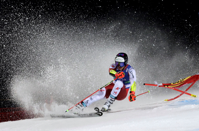 오스트리아의 파트리크 포이어슈타인이 24일 오전(한국시간) 오스트리아 슐라드밍에서 열린 국제스키연맹 알파인스키 월드컵 남자 대회전에서 슬로프를 빠르게 내려오고 있다.