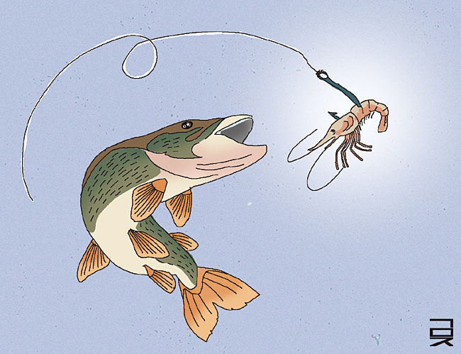 물고기가 먹으라고, 아니 물고기를 잡아먹으려고 던지는 미끼를 요즘은 사람이 먹는다. 인간이 만물의 영장이라지만 물에서는 물고기를 이길 재간이 없다. 물에서 자유자재로 헤엄치는 이 생물을 말 그대로 ‘물고기’로 만들기 위해서는 그물이나 낚시가 있어야 한다. 그물은 물고기가 다니는 곳에 잘 쳐놓기만 하면 되지만 낚시는 그 이상의 노력이 필요하다. 영리한 물고기를 꼬여 바늘을 물게 해야 하는데 그때 필요한 것이 바로 미끼이다.