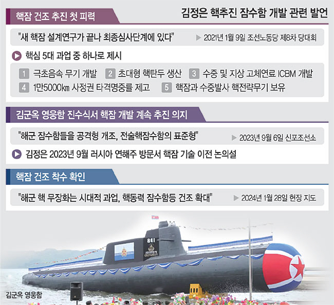 특히 김 위원장은 지난해 9월 러시아에서 블라디미르 푸틴 대통령과 가진 정상회담에서 포탄 및 신형 미사일 지원 대가로 소형 원자로 핵잠 기술 등을 제공받을 것이라는 보도가 나온 지 4개월 만에 그동안 지지부진하던 핵잠 개발에 속도를 내는 것으로 알려지면서 대책 마련이 시급하다는 지적이 나온다.