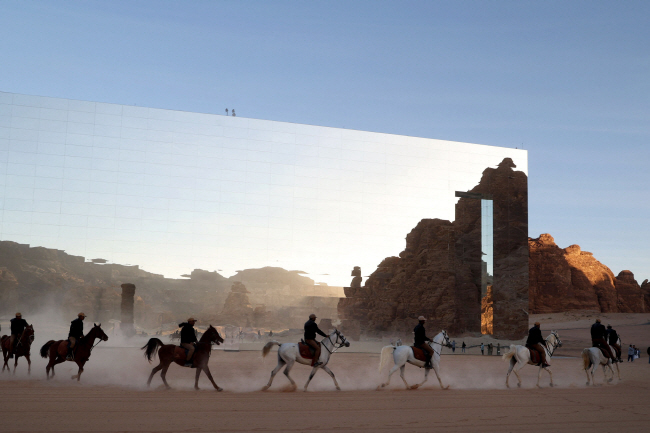 사우디아라비아 북서부 알울라 사막에 거울로 덮여 있는 마라야 콘서트홀 앞을 말을 탄 남성들이 지나치고 있다. 9740개의 거울이 외부를 덮고 있는 마라야 콘서트홀은 세계 최대 거울 외장 건축물로 기네스에 등재돼 있다. 마라야는 아랍어로 거울을 의미한다.