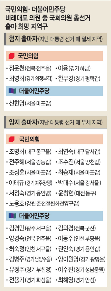 4월 국회의원 총선거에 출마하려는 여야 비례대표 의원들이 대부분 ‘험지’가 아닌 당선 가능성이 높은 ‘양지(陽地)’에 출마하려 해 당 안팎의 비판이 쏟아지고 있다. 4년 전 비례대표로 쉽게 공천을 받은 뒤 4년 의정 활동을 통해 쌓은 인지도를 바탕으로 당선되기 쉬운 지역구를 찾아 재선을 노리는 행태로, ‘비례대표 무용론’까지 자초하고 있다는 비판이 나온다.