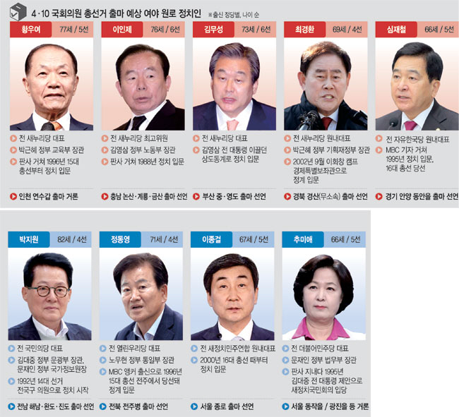 채진원 경희대 공공거버넌스연구소 교수는 2일 문화일보와 통화에서 “혐오 정치·증오 정치가 극에 달한 상황을 보면서 상대적으로 점잖은 어휘를 구사하고 여야 간 소통이 비교적 잘 이뤄졌던 정치를 해 왔던 ‘올드보이’들이 ‘내가 해 보겠다’고 나선 것이 아예 이해가 되지 않는 것은 아니다”면서도 “기회를 젊은 사람에게 넘기고 퇴진해 주는 게 맞는 행보”라고 밝혔다. 한 정치권 관계자는 “험지에 출마하거나 새로운 시대정신을 내세우면서 출마하는 게 아니라 자신의 지역구나 텃밭에 나오는 것은 인정받기 힘들다”고 밝혔다.