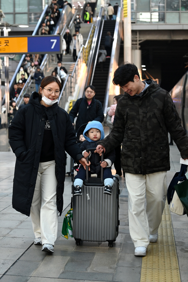 설 명절 연휴를 하루 앞둔 8일 오전 서울역에서 심영민, 김은비 씨 부부가 자녀 심문겸과 함께 창원으로 향하는 열차에 탑승하고 있다.