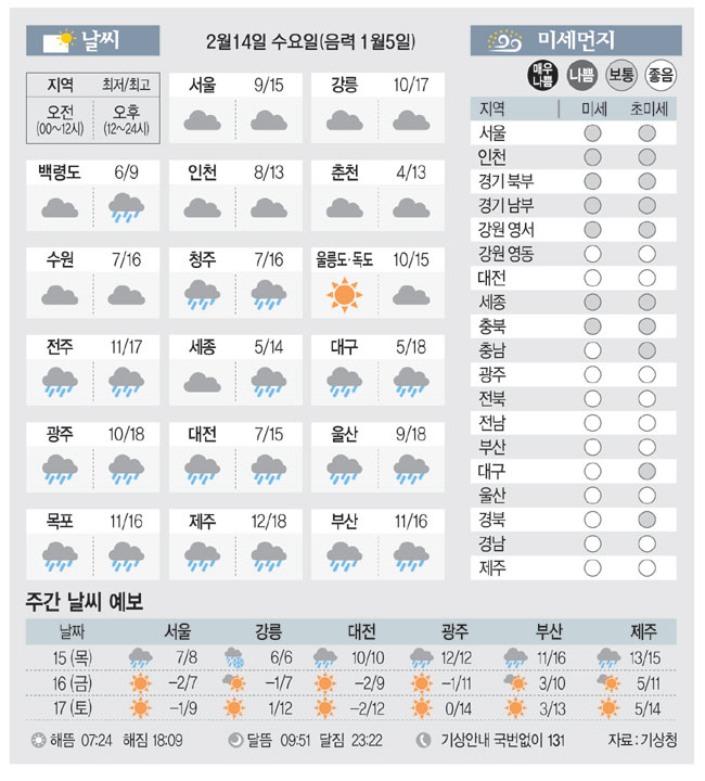 [날씨이야기] 2월14일 수요일(음력 1월5일)