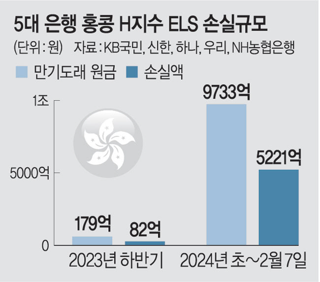 13일 금융권에 따르면 5대 은행이 판매한 H지수 기초 ELS 상품 가운데 올해 들어 지난 7일까지 모두 9733억 원어치의 만기가 돌아왔다. 이 중 손실액은 5221억 원으로 평균 손실률이 53.6%에 이른다. 올해 전체 15조4000억 원, 상반기에만 10조2000억 원의 H지수 ELS의 만기가 도래하는 만큼, H지수가 큰 폭으로 반등하지 못하고 현재 흐름을 유지할 경우 전체 손실액은 7조 원 안팎까지 불어날 전망이다.