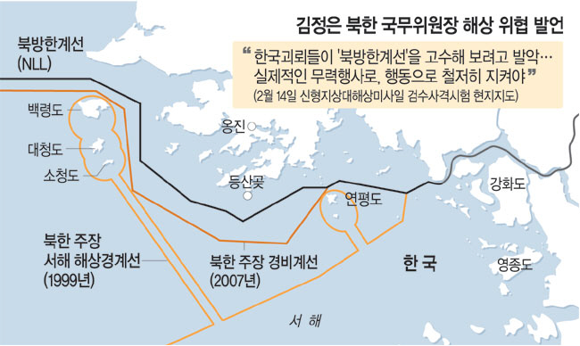김 위원장은 “조선 서해에 몇 개의 선이 존재하는지는 중요하지 않다”며 “우리가 인정하는 해상국경선을 적이 침범할 시에는 주권 침해·무력도발로 간주할 것”이라고 해, 우리 군의 해상 순찰이나 어선 단속을 문제 삼으며 기습적 군사 도발을 벌일 가능성을 열어놨다. 김 위원장은 지난달 최고인민회의 시정연설에서 “불법무법의 ‘북방한계선’을 비롯한 그 어떤 경계선도 허용될 수 없다”며 “영해를 0.001㎜라도 침범한다면 그것은 곧 전쟁 도발로 간주될 것”이라고 하는 등 올해 초부터 북방한계선 문제를 집중 제기하고 있다. 북한은 지난달 5일부터 7일까지 NLL 인근에서 해안포 사격도 벌였다.