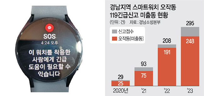 경남소방본부 관계자는 “스마트워치 오작동 신고는 SOS 모드를 잘못 누르거나 시계를 소파나 침대 등에 던졌을 때, 혹은 점프했을 때 발생하는 경우가 많은 것으로 파악됐다”며 “기기가 긴급상황을 감지한 후 대기 시간 동안 착용자가 오작동을 인지할 수 있도록 프로그램 개선이 필요하다”고 말했다.