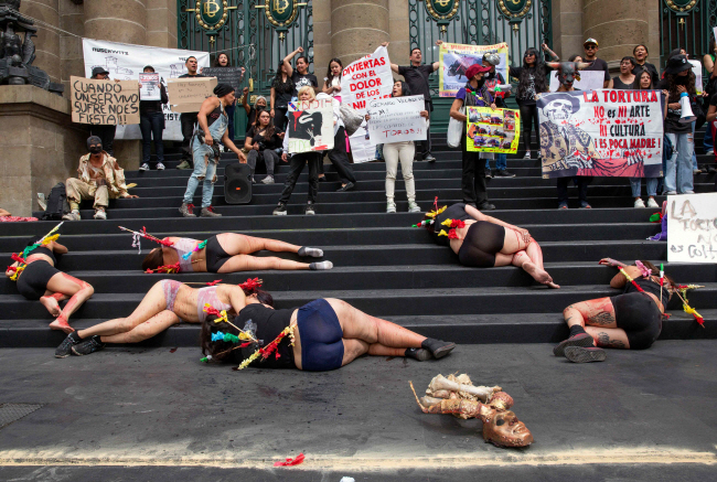 멕시코 동물 보호 단체 회원들이 14일 멕시코시티 의회 건물 앞에서 투우 경기 중 창에 맞아 피를 흘리며 쓰러진 소를 흉내 낸 모습으로 계단에 누워 투우 반대 시위를 벌이고 있다.