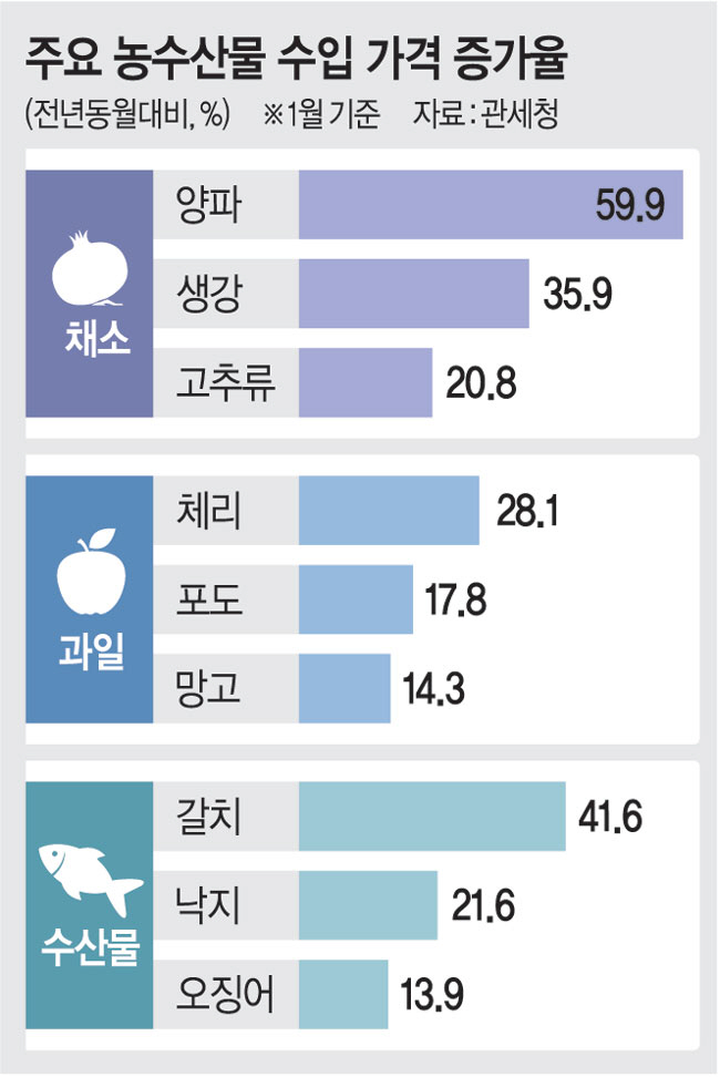 수입 농수산물 가격도 껑충 뛰고 있다. 관세청에 따르면 지난달 양파(신선) 수입 가격은 전년 동월 대비 59.9% 올랐다. 생강(35.9%), 고추류(20.8%), 양배추(12.0%) 등 다른 채소류와 체리(28.1%), 포도(17.8%), 망고(14.3%) 등 수입 과일도 가격이 지난해 같은 달보다 두 자릿수씩 올랐다. 갈치(41.6%), 낙지(21.6%), 오징어(13.9%) 등 다소비 냉동 어류도 수입 가격이 가파르게 오르고 있다.