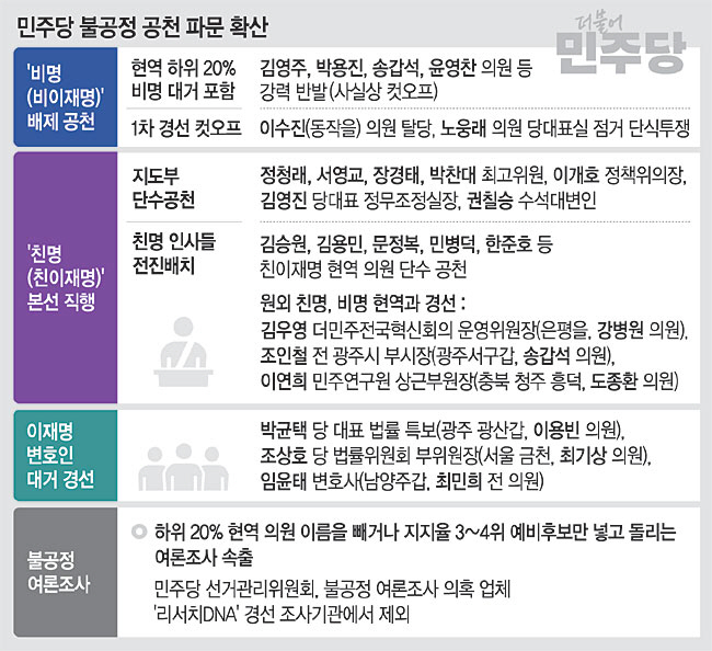 당내에서도 공천을 둔 ‘내부 저격’이 잇따르는 등 공천 파열음은 더욱 커지고 있는 상황이다. 광주 광산갑 이용빈 의원은 이날 오전 국회 소통관에서 기자회견을 열고 경선 상대인 박균택 전 광주고검장을 겨냥해 “검사독재정권 심판이라는 민주당 총선 기조를 정면으로 위배하는 고검장 출신 정치신인가산점 20% 적용을 당장 철회하라”고 촉구했다. 박 전 고검장은 이 대표 변호인 출신이다. 경기 분당갑 예비후보인 김지호 당대표 정무조정부실장도 이날 입장문을 내고 홍익표 원내대표를 향해 이광재 전 국회 사무총장의 분당갑 전략공천 논의 중단을 촉구했다.