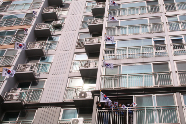 대구 달서구 월성코오롱하늘채 1단지 105동 아파트 130가구 모두에 태극기가 게양됐다. 이 아파트 입주민들은 지난 26일부터 태극기 달기에 나섰다. 태극기 달기는 아파트를 출입하는 입주민들에게 게양의식을 높이기 위한 것으로 아파트 정문 앞 동을 대상으로 추진됐다. 이 결과, 28일 입주민 100%가 태극기 게양에 동참했다. 곽병희 월성코오롱하늘채 1단지 입주자 대표회 회장은 “국민 모두 태극기 게양을 통해 나라를 사랑하는 마음을 실천해주기를 바란다”고 밝혔다.