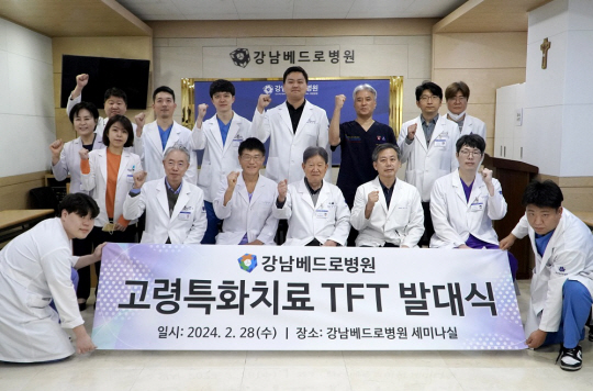 지난 28일 전담팀 발대식(사진)에는 TF 구상을 진두지휘한 윤강준 대표원장과 신경외과 강준기 명예원장, 척추센터 이춘성 원장을 비롯해 정형외과, 심장내과, 신장내과, 재활의학과 신경중재의학과, 노년특화 마취팀, 물리재활치료실장, 간호부장 등 TF 내 핵심 인원들이 참석했다.
