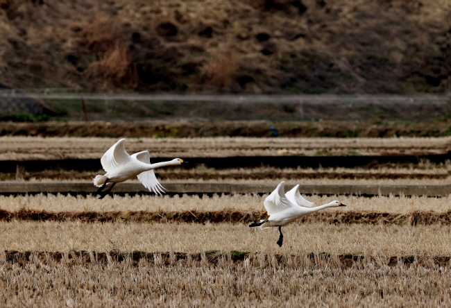 천연기념물이자 멸종위기야생생물Ⅰ급인 ‘고니’ 2개체가 4일 울산 울주군 온양읍 들녘에서 날고 있다. 고니가 울산에 온 것은 이번이 처음이다.