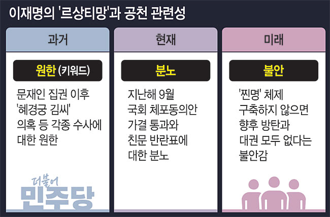 르상티망 : 이재명의 마음속엔 문재인과 친문에 대한 원한과 분노와 불안이 중층적으로 쌓여 있어. 이는 이재명이 총선을 앞두고 왜 ‘친문학살’ 공천에 열을 올리는지, 왜 ‘비명횡사’에 열중하는지를 말해주는 것.