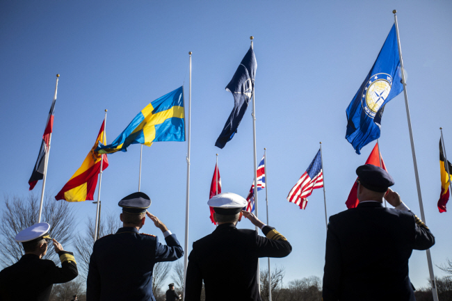 스웨덴의 나토(북대서양조약기구) 합류를 축하하는 스웨덴 국기 게양식이 나토 각국 대표단과 스웨덴 정치권 인사들이 참여한 가운데 11일 벨기에 브뤼셀 나토 본부에서 열리고 있다. 스웨덴 국기는 알파벳 순서에 따라 스페인과 튀르키예 국기 사이에 게양됐다.