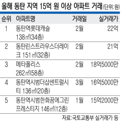 12일 부동산 업계에 따르면 올해 들어 동탄역 주변 대형 평수 아파트에서 15억 원 이상 고가 거래가 5건이나 나왔다. 지난 2월에는 동탄 아파트 사상 최고가인 20억 원 이상 실거래가 2건이나 신고됐다. 지난해 같은 기간 15억 원 이상 아파트 거래가 1건에 불과했던 것과 대조적이다. 업계에서는 고가 거래에 GTX 개통 호재 실현이 임박한 데다, 대기업과 협력업체가 결집할 반도체 클러스터의 배후 주거지라는 동탄의 입지적 우위가 영향을 미쳤다고 본다. 윤지해 부동산R114 수석연구원은 “현시점에서 보면 비싼 거래라고 생각할 수 있지만, 그 지역에 꼭 거주해야 하고 자산 여력이 있는 수요층이 장기적인 안목에서 선택했을 수 있다”고 말했다.