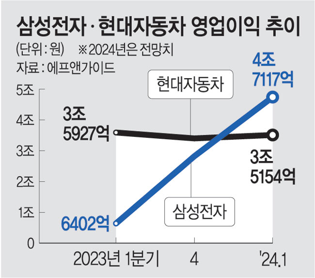 한국 수출의 버팀목이자 ‘원투 펀치’ 역할을 톡톡히 하는 삼성전자와 현대자동차가 올해 1분기 ‘상장사 실적 1위’ 자리를 두고 접전을 벌이고 있다. 지난 한 해 내내 현대차에 분기 영업이익 1위 자리를 내준 삼성전자가 5분기 만에 이를 되찾을 수 있을지 관심이 쏠린다. 메모리를 중심으로 반도체 업황이 회복세를 보이며 올해 1분기에는 순위가 다시 뒤바뀔 가능성이 제기된다.