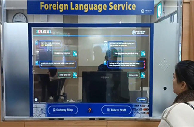 서울교통공사는 외국인 관광객의 지하철 이용 편의를 높이기 위해 ‘외국어 동시 대화 시스템’을 외국인 이용이 많은 11개 역에서 확대 운영한다고 14일 밝혔다. 시스템은 1호선 종로5가역, 2호선 시청역·홍대입구역·을지로입구역·강남역, 3호선 경복궁역, 4호선 명동역, 5호선 광화문역·김포공항역, 6호선 이태원역·공덕역 등 총 11곳에서 이용할 수 있다. 이 시스템은 투명한 유기발광다이오드(OLED) 디스플레이를 사이에 두고 외국인과 역 직원이 자국어로 대화하는 방식이다. 말을 꺼내면 자동 통역 후 디스플레이에 대화 내용이 문자로 표출된다. 이용자는 시스템 시작 화면에서 사용언어를 선택해 서비스를 이용할 수 있다. 영어, 일본어, 중국어 등 13개 언어가 지원된다. 화면을 통해선 지하철 경로 검색도 할 수 있으며 환승 및 소요 시간 정보와 요금 안내, 물품 보관함(T-라커)·유인 보관소(T-러기지) 현황 정보 등도 볼 수 있다. 지난해 12월부터 3개월간 이 시스템을 시범 운영한 명동역 관계자는 “이전에는 영어로 의사소통이 불가능한 관광객과는 소통하기 어려웠는데 시스템 도입으로 정확한 정보를 제공할 수 있게 됐다”고 말했다.