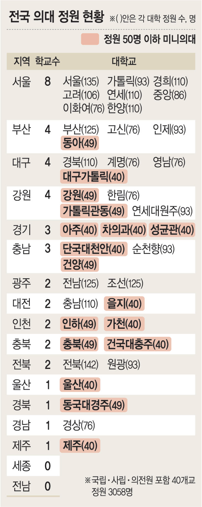 14일 의료계와 정부 부처에 따르면 정부는 오는 15일 의대가 있는 전국 40개 대학 의대 증원 배정에 착수할 것으로 알려졌다. 2025학년도 의대 증원분인 2000명은 지역과 수도권에 각각 8 대 2 비율로 배정된다는 방침이다. 내년도 입시부터는 지역 의대와 수도권 의대에 각각 1600명, 400명이 증원되는 것이다. 정원 50명 이하 소규모 의대 17개 대에 우선 배정될 것으로 보인다. 40개 의대가 지난달 신청한 의대 증원 규모가 3401명인 만큼, 소규모 의대의 경우 현재보다 2배 이상으로 늘어날 것으로 전망된다. 각 대학별 증원 규모는 이르면 이달 말 늦어도 다음 달 초 확정된다.