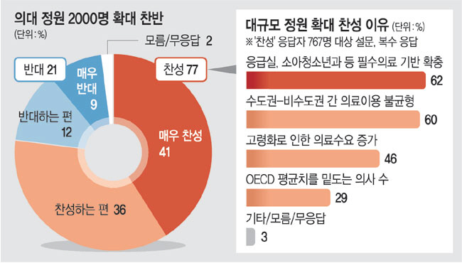18일 문화일보가 여론조사기관 엠브레인퍼블릭에 의뢰해 지난 15일부터 16일까지 진행한 ‘의대 정원 확대에 대한 대국민 여론조사’ 결과에 따르면 ‘의대 정원 2000명 증원’의 찬반을 묻는 질문에 ‘찬성한다’가 전체의 77%(매우 찬성 41%, 찬성하는 편 36%)로 ‘반대한다’는 의견 21%(매우 반대 9%, 반대하는 편 12%)에 비해 크게 높았다. 조사에 따르면 의대 증원 방침에 대해 전 연령·성별에서 70% 이상이 찬성 의견을 나타냈다.