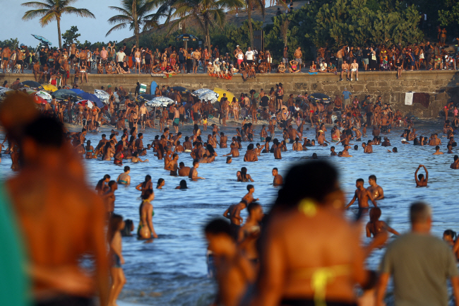 가을로 접어든 브라질이 ‘열돔현상’으로 폭염에 시달리고 있는 가운데 17일 리우데자네이루 이파네마 해변에 몰려든 시민들이 바다에 들어가 더위를 식히고 있다. 리우경보시스템(SAR)에 따르면 이날 리우데자네이루의 체감온도는 공식 측정 시작 이후 최고치인 62.3도를 기록했다.