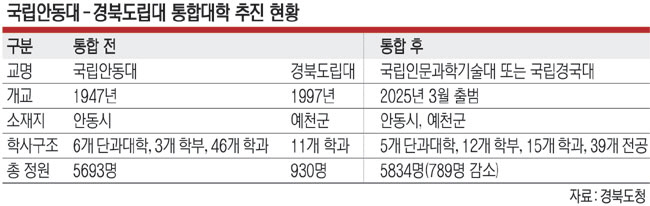 25일 각 지방자치단체와 대학에 따르면 지난해 6월 1차 글로컬대학30 사업 공모에 전국 108개 대학이 신청했으며 이 가운데 지난해 11월 10개가 최종 선정됐다. 또 통합을 전제로 국립안동대·경북도립대, 부산대·부산교대, 강원대·강릉원주대, 충북대·한국교통대 등 4개가 최종 지정됐다. 경북 안동 안동대와 경북 예천 경북도립대는 구성원들의 동의를 거쳐 글로컬대학30 사업에 지정되기도 전인 지난해 10월 통합신청서를 교육부에 제출했다. 경북도 관계자는 “교육부가 약 6개월에 걸쳐 심사 중이며 걸림돌이 거의 없다”며 “오는 4월 통합 승인이 나면 이행 절차를 밟은 뒤 2025년 3월 통합 대학으로 개교할 것”이라고 밝혔다.