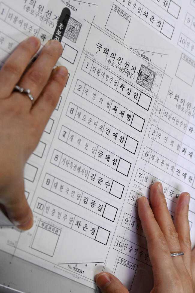 제22대 국회의원 총선거를 9일 앞둔 1일 오전 서울 중구 초동의 한 인쇄소에서 종로구선거관리위원회 직원이 종로구 국회의원 투표용지에 규격견본 OHP 필름을 덧대보며 규격을 점검하고 있다.