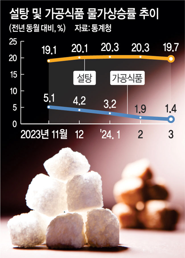 그러나 가공식품의 주원료인 설탕은 지난해 8월(13.9%)부터 지난달(19.7%)까지 8개월간 두 자릿수 상승률을 기록하고 있다. 특히 지난해 12월(20.1%)에 이어 올해 1월(20.3%)과 2월(20.3%)에는 20%대를 돌파하는 등 물가의 상승 압력을 키우고 있다. 설탕은 전체 물가상승률이 6%대를 넘어섰던 2022년 7월(18.4%)부터 지난해 6월(13.2%)까지 1년간 두 자릿수 상승률을 달리는 바람에 물가 당국과 관련 업계의 불안감이 커지기도 했다.