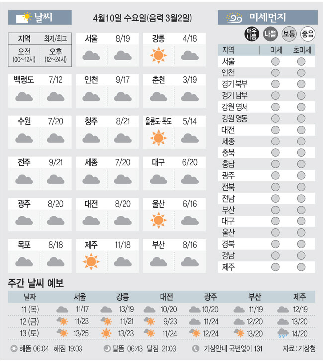 [날씨이야기] 4월10일 수요일(음력 3월2일)