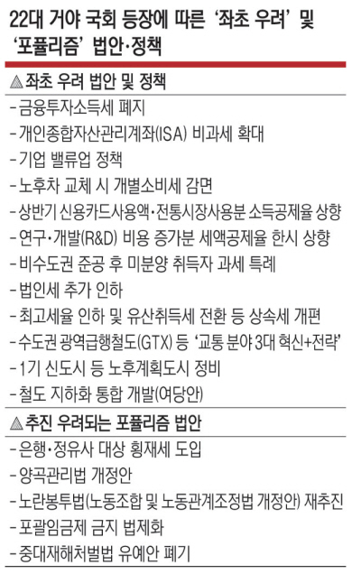 윤석열 정부 출범 당시 소폭 내린 법인세에 대한 추가 인하 논의도 이젠 꺼내기조차 힘들어졌다. 반면 야당이 추진하는 포퓰리즘 법안들은 통과될 가능성이 한층 커졌다. 과잉생산 쌀에 대한 정부 보전을 담은 양곡관리법 개정안과 노조의 불법파업에 대한 책임을 묻지 말자는 노란봉투법은 이미 한 차례 대통령 거부권이 행사됐지만 새 국회에서 야당이 재추진할 가능성이 크다. 중소기업계의 염원이었던 중대재해처벌법 유예안 논의도 사실상 좌초될 것으로 보인다.
