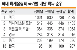 한국은 역대 하계올림픽에서 총 287개(금 96·은 91·동 100)의 메달을 따냈다. 한국은 지난 1976년 몬트리올 대회에서 사상 첫 올림픽 금메달을 획득한 이래 매 대회(1980년 모스크바 대회 불참) 금을 추가했고, 3년 전 열린 도쿄대회(금6·은4·동10)까지 금메달은 총 96개를 수확했다.