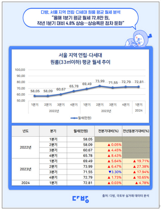 다방이 분석한 데이터에 따르면, 작년 한 해 동안 서울 지역 원룸의 평균 월세는 작년 1분기 69만5000원, 2분기 74만 원, 3분기 71만6000원, 4분기 72만8000원으로 상승세를 유지했다.