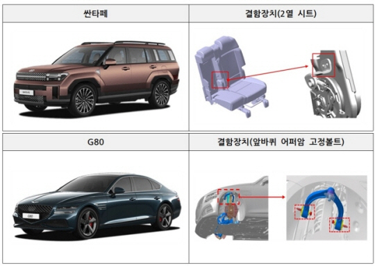 우선 현대차 싼타페 등 2개 차종 6468대는 2열 시트 제조 불량으로, 차량 충돌 시 시트가 정상적으로 고정되지 않아 안전에 지장을 줄 가능성이 발견됐다.