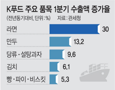 18일 관세청 자료를 보면 올해 1분기 라면 수출액은 총 2억7000만 달러(약 3768억 원)로 지난해 같은 기간(2억700만 달러)과 견줘 30%나 늘어 역대 최고치를 기록했다. 미국 수출액이 4700만 달러로 전년 동기(2200만 달러) 대비 112.4% 급증하면서 전체 수출액 증가를 견인했다. 빵·파이·비스킷 등 베이커리 제품 수출액은 같은 기간 5.3% 늘어난 9090만 달러로 집계됐다. 당류·설탕과자 수출액은 전년 동기 대비 9.6% 늘어난 8415만 달러로 나타났고, 김치 수출액도 4200만 달러로 같은 기간 6.1% 증가했다. 최근 미국 CNN 등 외신에서 호평을 받은 만두도 수출액이 1753만 달러로 전년 동기(1549만 달러) 대비 13.2% 증가했다.