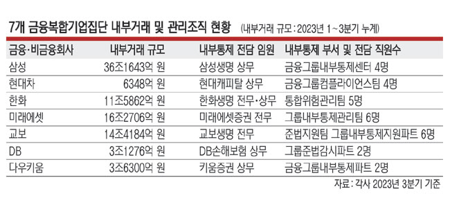 23일 금융권에 따르면 금융감독원은 금융복합기업에 적용할 수 있는 ‘내부통제 기준 표준안’을 별도로 마련해 조만간 적용할 계획이다. 삼성·현대차·한화·교보·미래에셋·DB·다우키움 등이 2023년 기준 금융복합기업에 해당하며, 표준안 적용을 위한 실무협의체가 가동될 예정이다. 표준안에는 일부 기업집단의 정기 검사를 통해 확인한 유사 지적 사항인 △위험관리 전담부서 확대 △자본 적정성 비율 산정 개선 △내부거래 관리 체계 정비 등이 담길 것으로 보인다. 금감원은 지난해 1월부터 올해 1월까지 삼성, 현대차, 교보 등에 대해 내부통제·위험 관리 부실과 관련한 다수의 경영 유의 및 개선 사항을 통보한 바 있다.