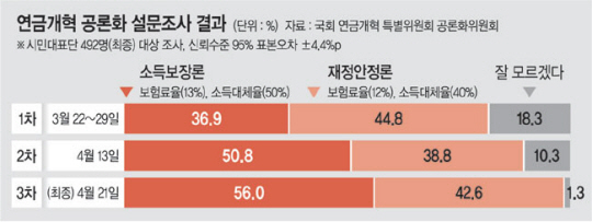 반면 연금특위 야당 간사인 민주당 김성주 의원은 "노후 불안 해소를 위해 소득보장이 우선이라는 국민의 뜻을 확인했다"며 이번 결과에 환영 입장을 밝혔다.